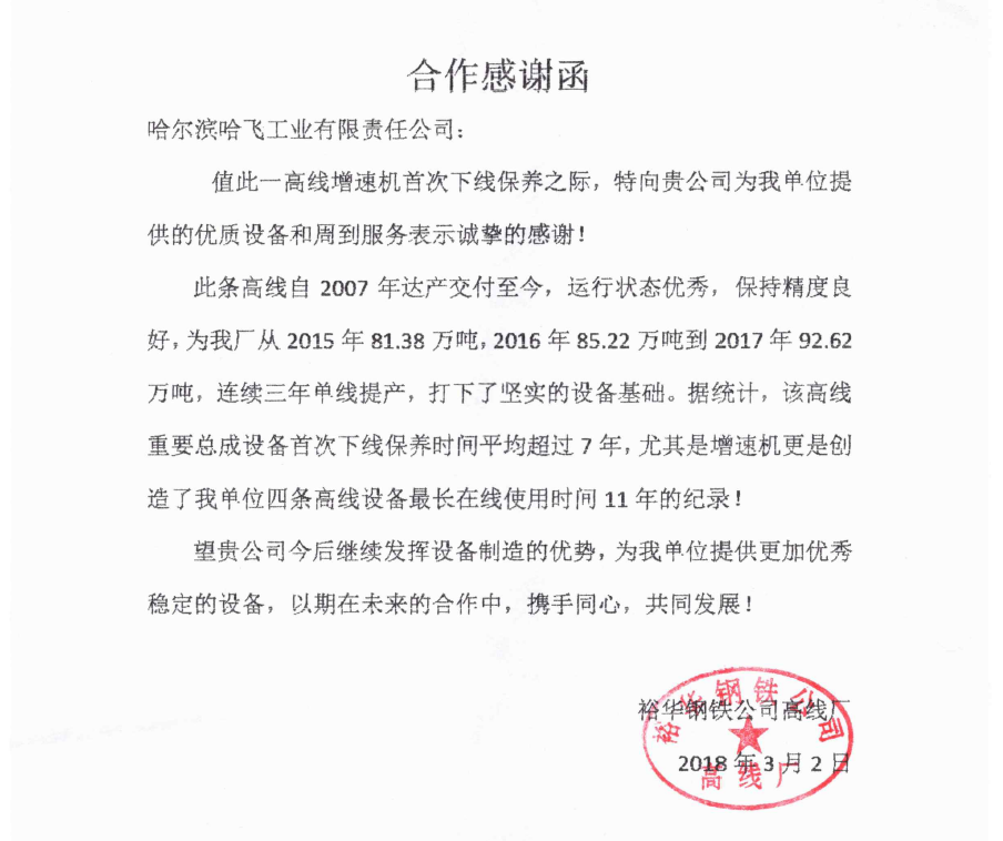 哈爾濱哈飛工業(yè)有限責(zé)任公司旗下的機(jī)電設(shè)備制造產(chǎn)業(yè)是目前國(guó)內(nèi)規(guī)模大、專業(yè)的高速線材軋機(jī)和棒材軋機(jī)整機(jī)及備件的生產(chǎn)制造企業(yè)。公司現(xiàn)坐落于哈爾濱市平房區(qū)汽車零部件工業(yè)園B區(qū),占地面積30000多平方米。現(xiàn)有員工近550人,其中具有中高級(jí)職稱的研發(fā)及工程技術(shù)人員100余人。   公司曾獲得冶金部授予的“高線軋機(jī)設(shè)備優(yōu)單位”稱號(hào)、國(guó)家技術(shù)進(jìn)步二等獎(jiǎng)等獎(jiǎng)項(xiàng),公司生產(chǎn)的十八項(xiàng)高線軋機(jī)重要部件通過(guò)了技術(shù)鑒定... +MORE